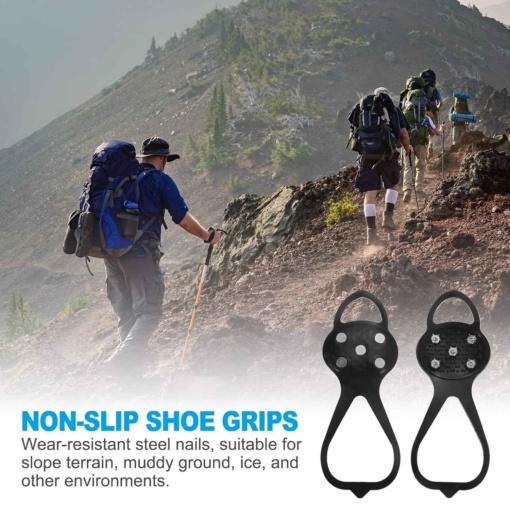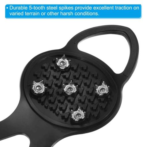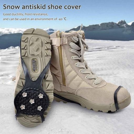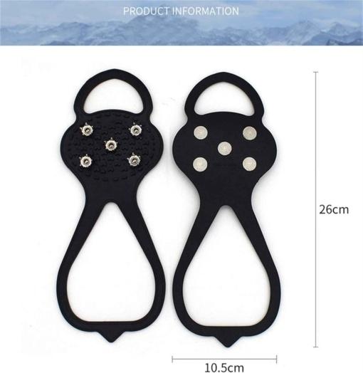 Анти-лизгачката заштита на чевли е изработена од издржлива црна гума со челични столпчиња против лизгање, кој нуди одличен стисок дури и при температури под -40 °C. Оваа високоеластична гума се вклопува на сите чевли, одлична за мажи и жени. Лесно се става и се отстранува, а компактна е за носење, така што можете да ја ставите во чанта или џеб. Погодна е за патики, чизми или секојдневни чевли, идеална заштита за зимски активности на отворено. Заштитете се од лизгање на мраз и снег!