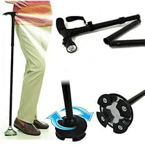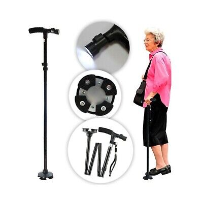 Широката основа идеално функционира на нерамни површини, зголемувајќи ја вашата безбедност. Опремен е со 3 ротирачки вградени LED светла, осигурувајќи одличен вид во ноќта. Висината може да се прилагоди од 86 cm до 95,5 cm, а може да се преклопи за неколку секунди, што го прави лесен за носење во чанта.