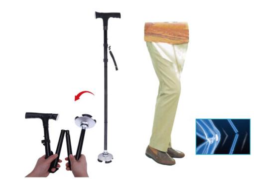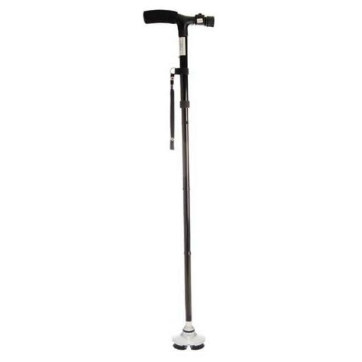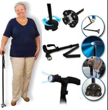 Безбедносно помагало при одење со ЛЕД светло нуди слобода при движење и безбедност. Станува збор за екстра-широк 360 ° вртечки обрач со 4 стабилизатори кој обезбедува сигурно и стабилно одење без лизгање. Ова помагало стои самостојно, што е корисно кога ви требаат двете раце слободни. Широката основа идеално функционира на нерамни површини, зголемувајќи ја вашата безбедност. Опремен е со 3 ротирачки вградени LED светла, осигурувајќи одличен вид во ноќта. Висината може да се прилагоди од 86 cm до 95,5 cm, а може да се преклопи за неколку секунди, што го прави лесен за носење во чанта.