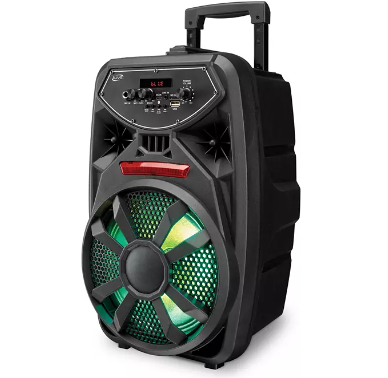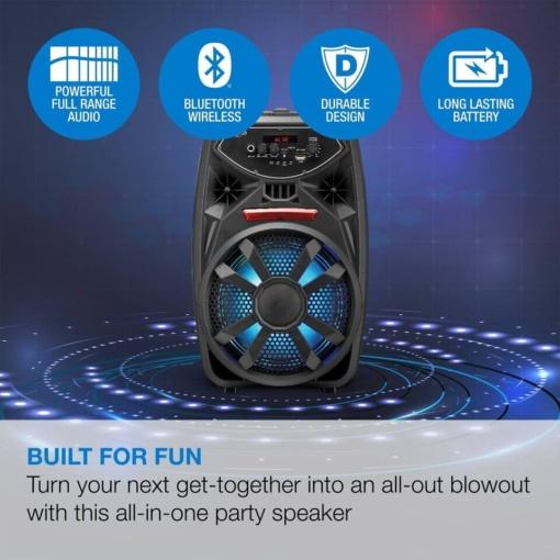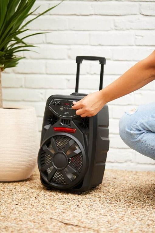 Безжичниот звучник за забави нуди целосен звук со длабоки и ниски тонови, идеален за сите ваши забави. Со Bluetooth поврзување, лесно можете да го поврзете вашиот уред и да ја започнете забавата. Вградените LED светлосни ефекти создаваат концертна атмосфера, а микрофонскиот влез ви овозможува комплетна забава со караоке. Целата преносливост е овозможена преку ергономска рачка и тркала, што го прави лесен за движење.