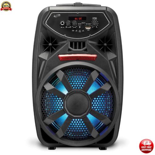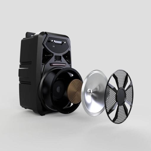Звучникот поддржува Bluetooth v5.0, FM радио, микро SD и USB порти за репродукција на аудио датотеки. Има вграден 8-инчен звучник со фреквенција од 70Hz до 10kHz и осетливост од 81dB. Со вградена батерија што трае до 6 часа и време на полнење од 4-5 часа, оваа единица е совршена за долги забави. Уживајте во квалитетниот звук и динамичните светлосни ефекти на вашиот следен настан.