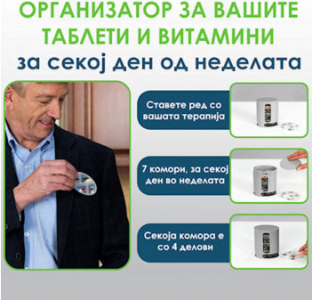 Кутијата вклучува 7 преносни ленти кои можете да ги понесете со себе, совршени за работа, училиште или одмор. Секој ден е јасно означен и преградите се лесно отстранливи, што ви овозможува да ги носите само оние апчиња што ви се потребни.