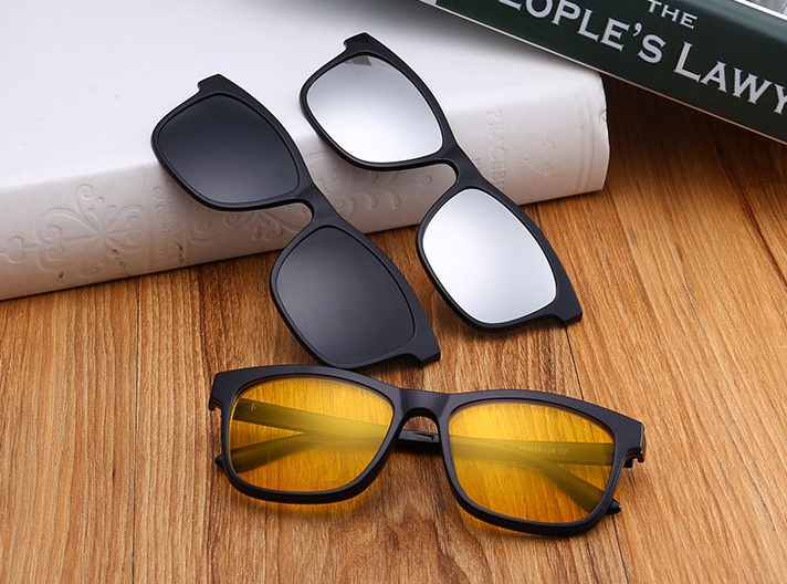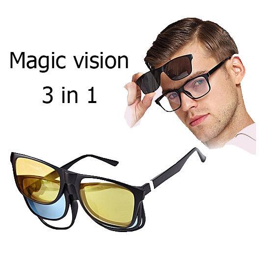 Магични поларизирани очила со магнети кои го нормализираат видот. Вклучуваат транспарентни поларизирани леќи, како и жолти леќи за ноќно возење и сини леќи за дневна светлина, кои лесно се поставуваат со магнети. Овозможуваат брза промена на леќите и стилот. Елегантната рамка е лесна и удобна за носење, а модерната форма одговара на повеќето лица.
