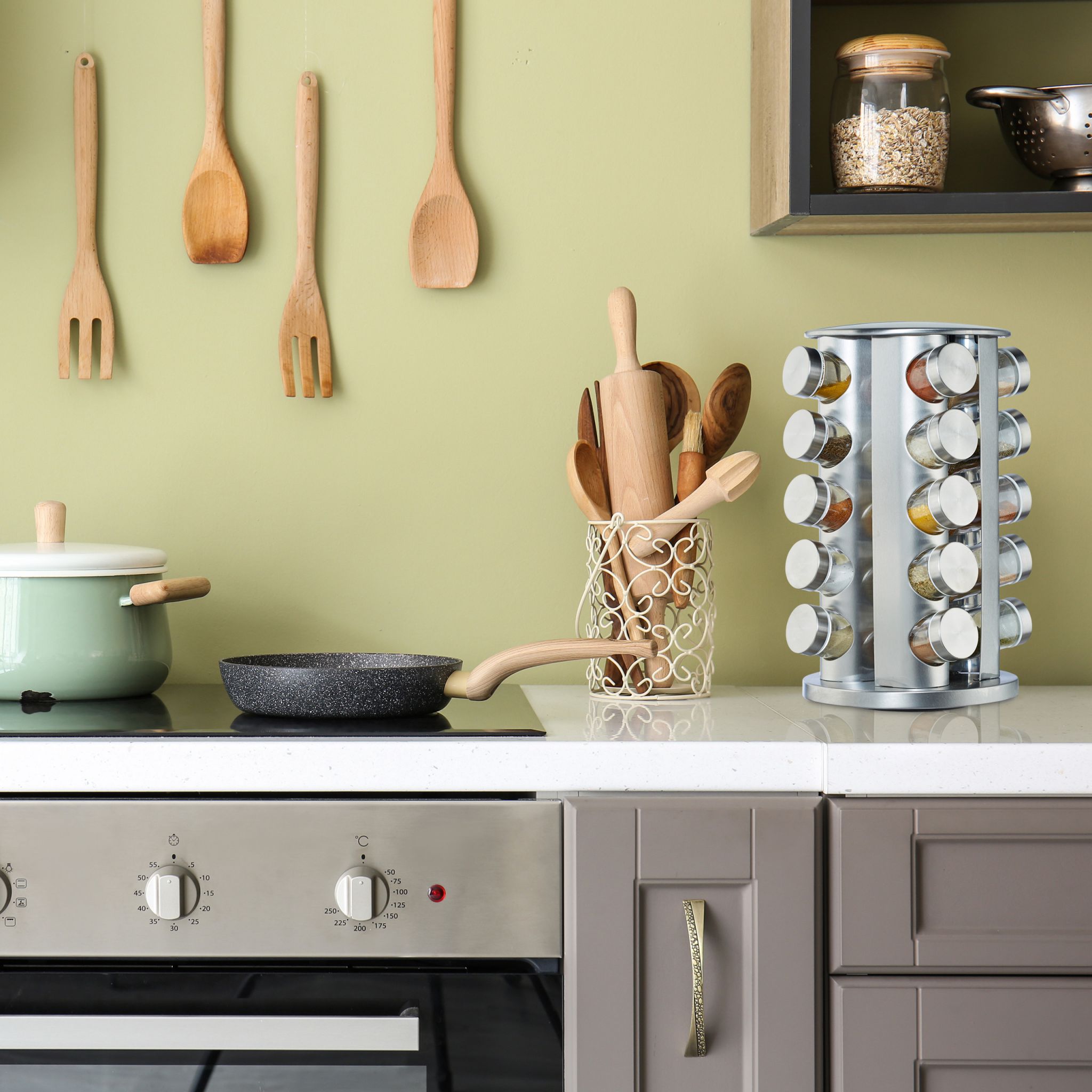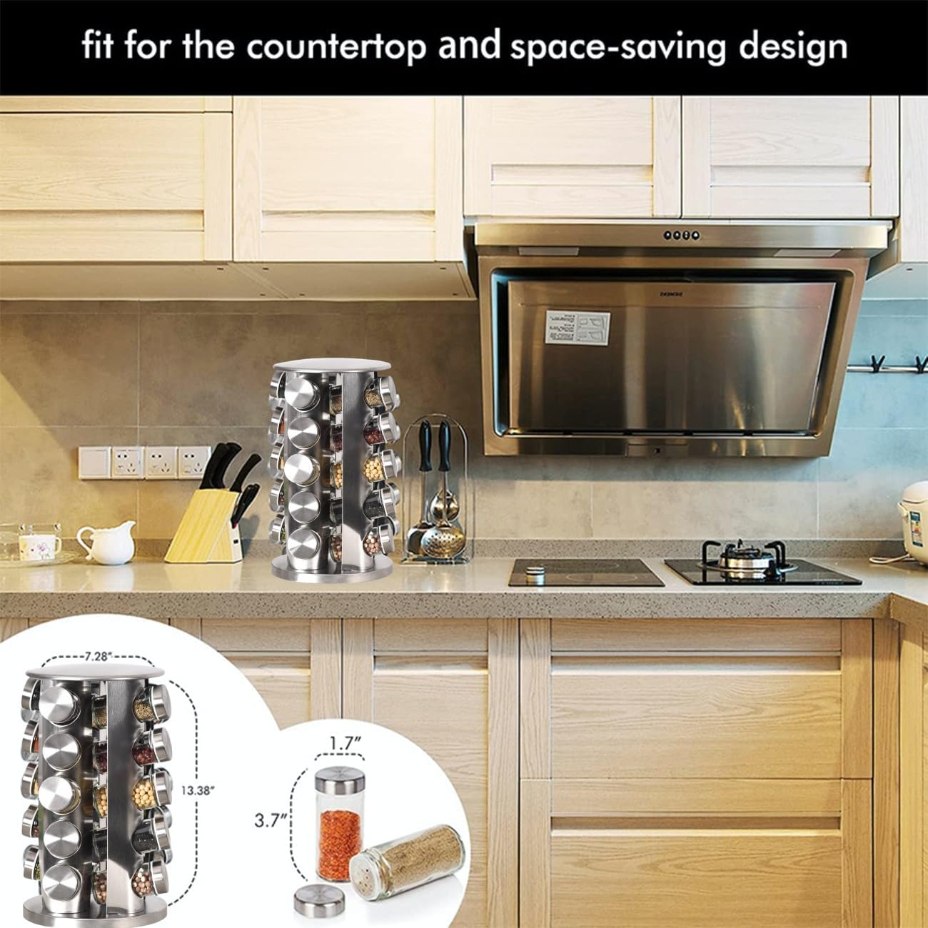 Организирајте ги вашите зачини стилски! Овој ротирачки држач со 20 теглички од нерѓосувачки челик е идеален за лесен пристап и ефикасно готвење во вашата кујна.