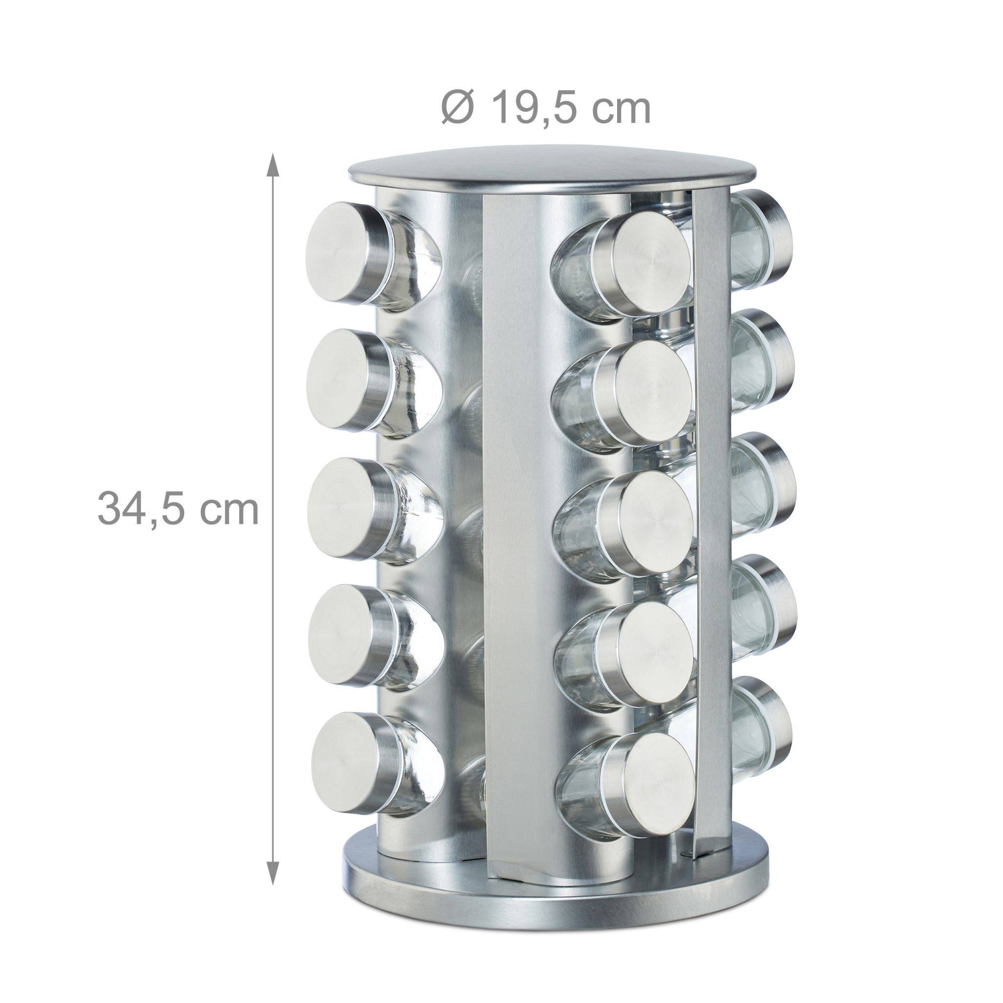 Сет од 20 стаклени теглички за чување на зачини, поставени на елегантен држач од нерѓосувачки челик. Овој ротирачки држач за зачини ви овозможува лесен пристап до вашите омилени зачини, што го прави готвењето поефикасно. Компактен е и просторно ефикасен, идеален за кујнска плотна или полица без да зазема многу простор. Димензии на држачот: 34,5 x 19,5cm, тегличка: 9,5 x 4,5cm. Организирајте ги зачини без напор и уживајте во готвењето!
