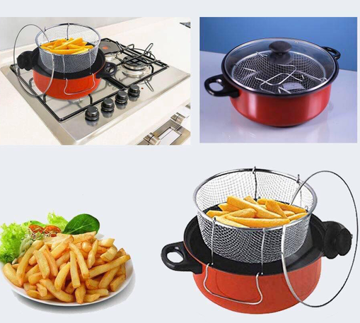 Сет за готвење – тенџере и фритеза е практично решение за секој дом. Овој сет ви овозможува лесно подготвување на различни јадења, помфрит, парен зеленчук, пржена храна, супи, разни варива, сосови, тестенини и др. Издржливиот дизајн и лесното чистење го прават идеален за секојдневна употреба.
