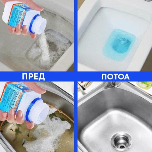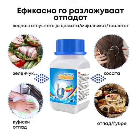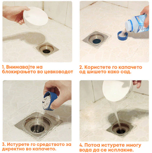Безбеден е за употреба, не ги оштетува цевките или септичките системи, што го прави идеално решение за кујни и бањи. Може да се користи и превентивно за одржување на чистота и функционалност на одводите, оставајќи ги вашите мијалници чисти и без непријатни мириси.